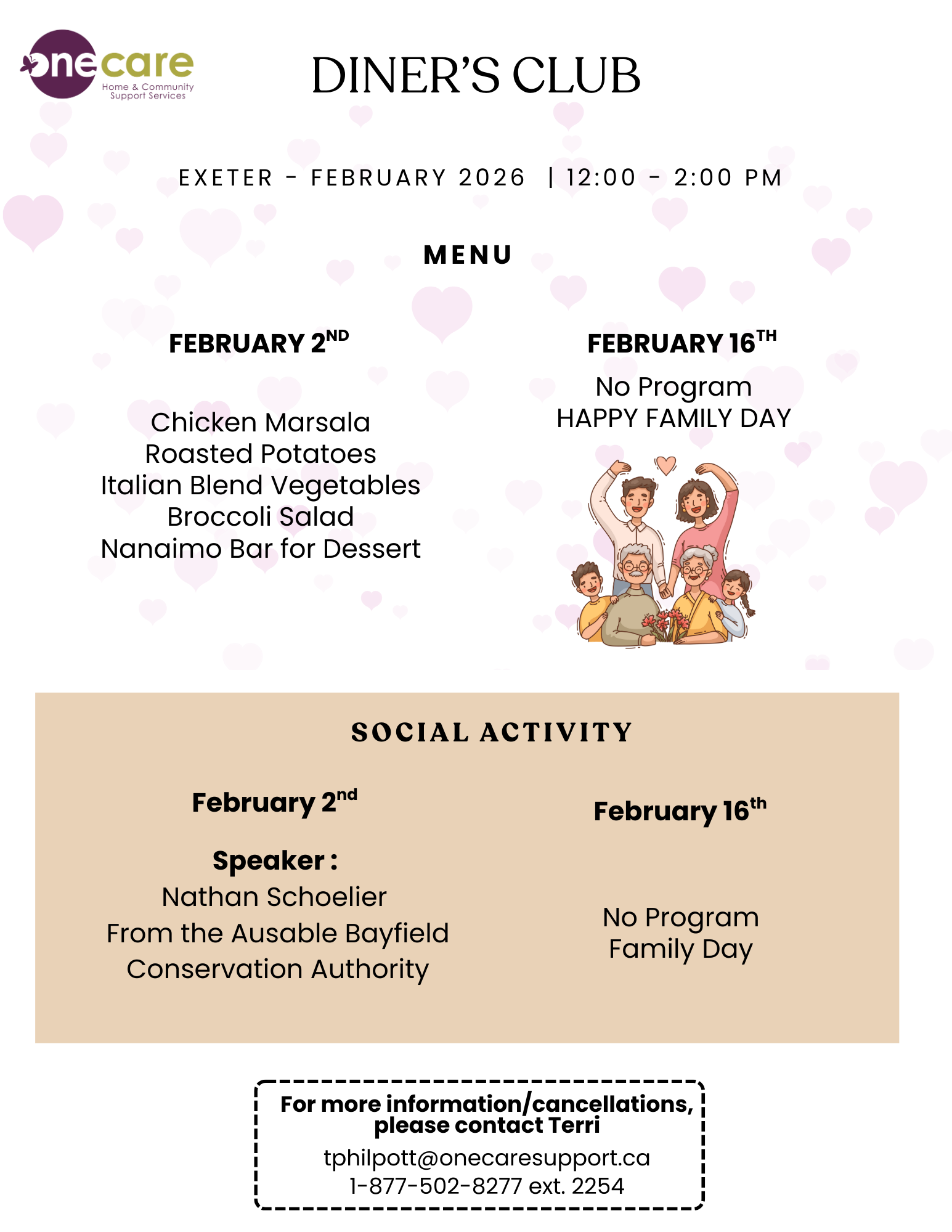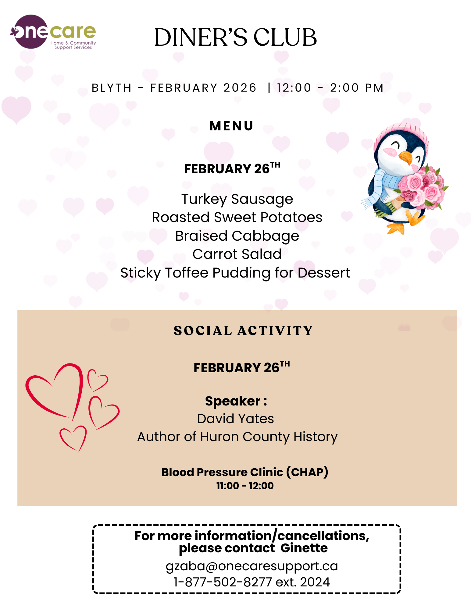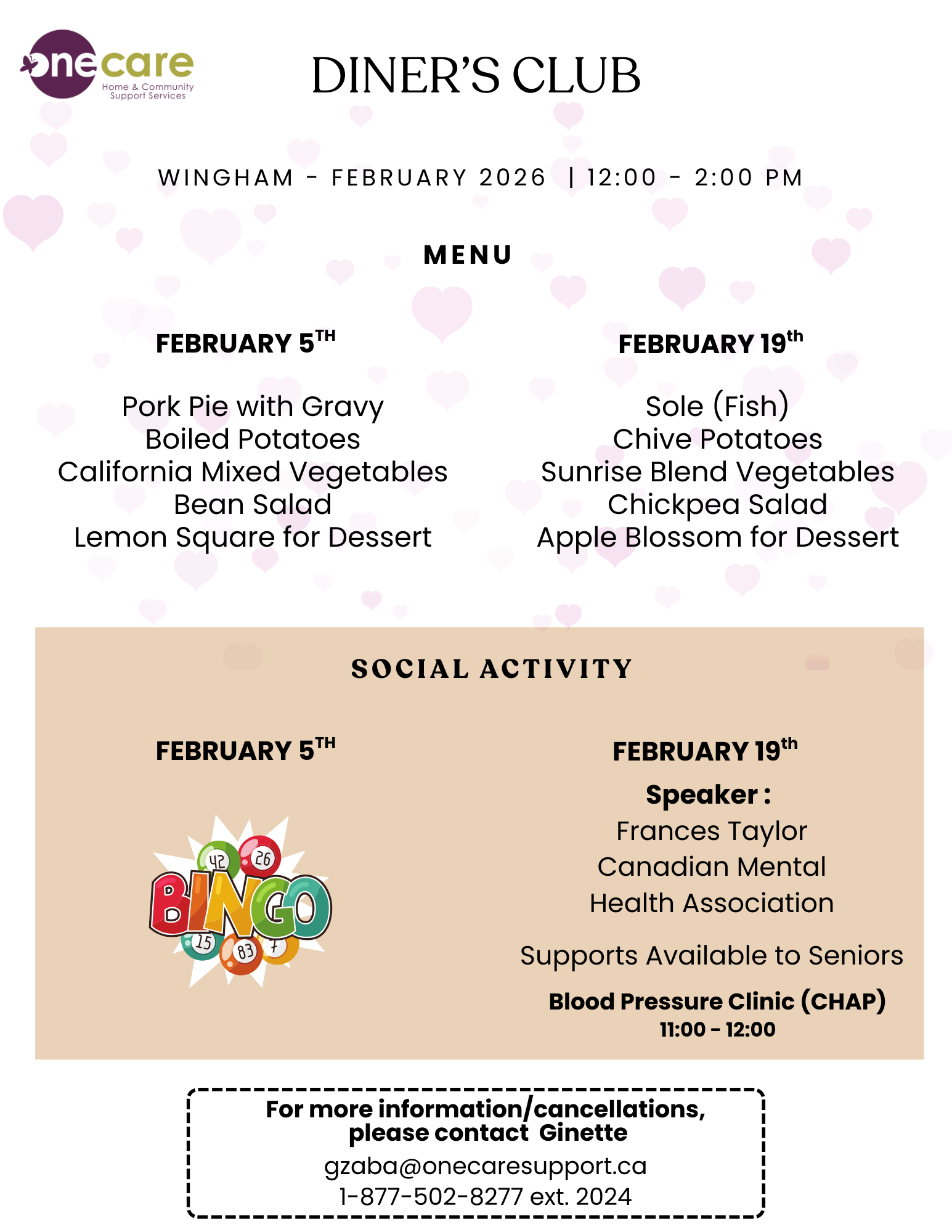 ONE CARE’s dining programs take place in communities throughout Huron County, and Stratford in a variety of program facilities. Each meal consists of a salad, entrée, juice and a dessert.